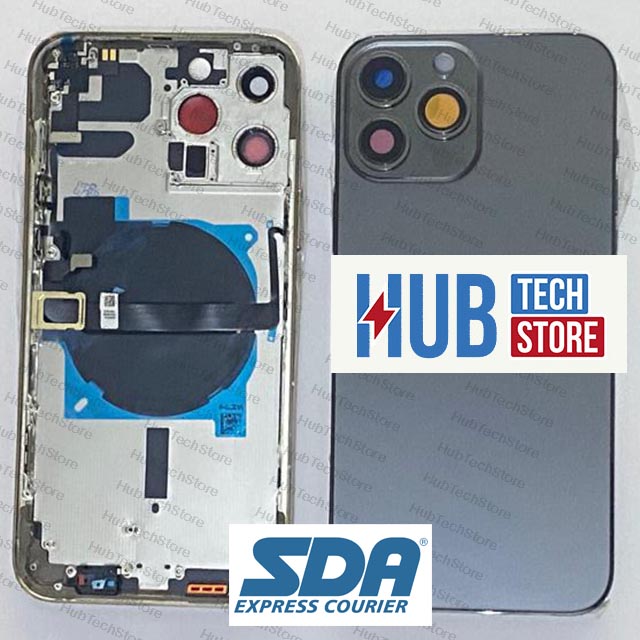 SCOCCA POSTERIORE BACK COVER + FRAME + FLAT COMPLETA PER IPHONE 13 PRO MAX NERO – SIDERAL GREY, COMPLETO DI CARRELLO SIM + TASTI POWER E VOLUME ESTERNI + FLAT POWER E VOLUME + CARICA WIRELESS + FILTRI ANTI POLVERE INFERIORI